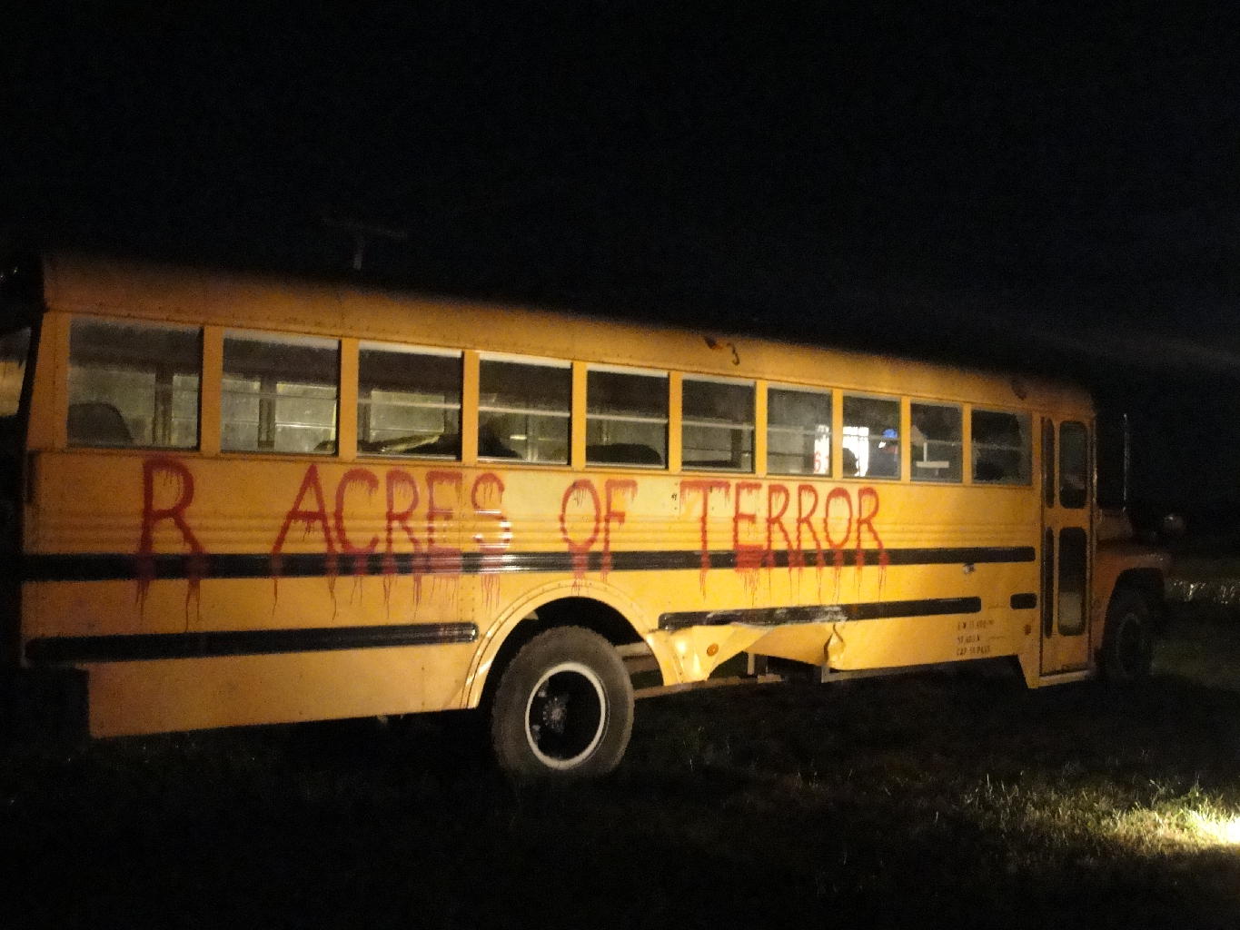 The R Acres of Terror haunted ‘house’ is set on the State Highway in Dow, south of Jerseyville; look for the parked school bus. Less of a haunted house and more of a haunted thicket. The Acres of Terror facility is a roped and well staged path for visitors to tread through a segment of forest while passing through many creepy or gruesome set pieces while actors roam about to frighten them.