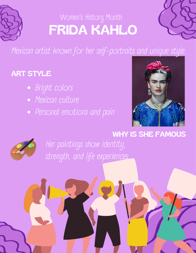 Kahlo’s paintings are known for their bright colors and symbolic images. Many of her works are self-portraits that explore themes such as culture, gender, identity, and personal struggle. Her art was inspired by Mexican traditions and her own life experiences. Even though she lived during a time when female artists were often overlooked, Kahlo developed a unique style that made her stand out in the art world.