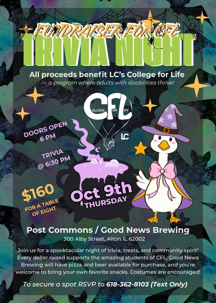 The event will take place Thursday, Oct. 9, at the Post Commons/Good News Brewing in Alton. Doors will open at 6 p.m., with trivia beginning at 6:30 p.m. The cost is $160 for a table of 8–with all proceeds benefiting Lewis and Clark Community College’s College for Life program. Costumes encouraged!