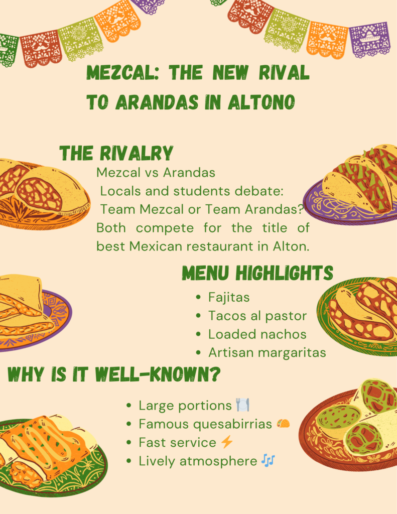 The restaurant has become the main culinary rival of Arandas Mexican Restaurant, as both compete for the informal title of best Mexican restaurant in Alton. Among locals and students, the frequent question is: Team Mezcal or Team Arandas?