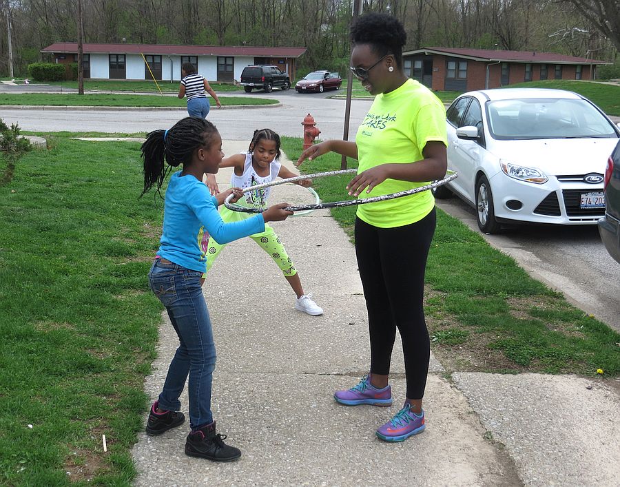 Lewis and Clark Community College students volunteered their services in a variety of locations in our communities as part of L&C Cares April 13-17. The event is being held in conjunction with National Volunteer Week. Pictured are L&C student volunteer Samira Bell playing hula hoop with children at Alton Acres of Alton Housing Authority.